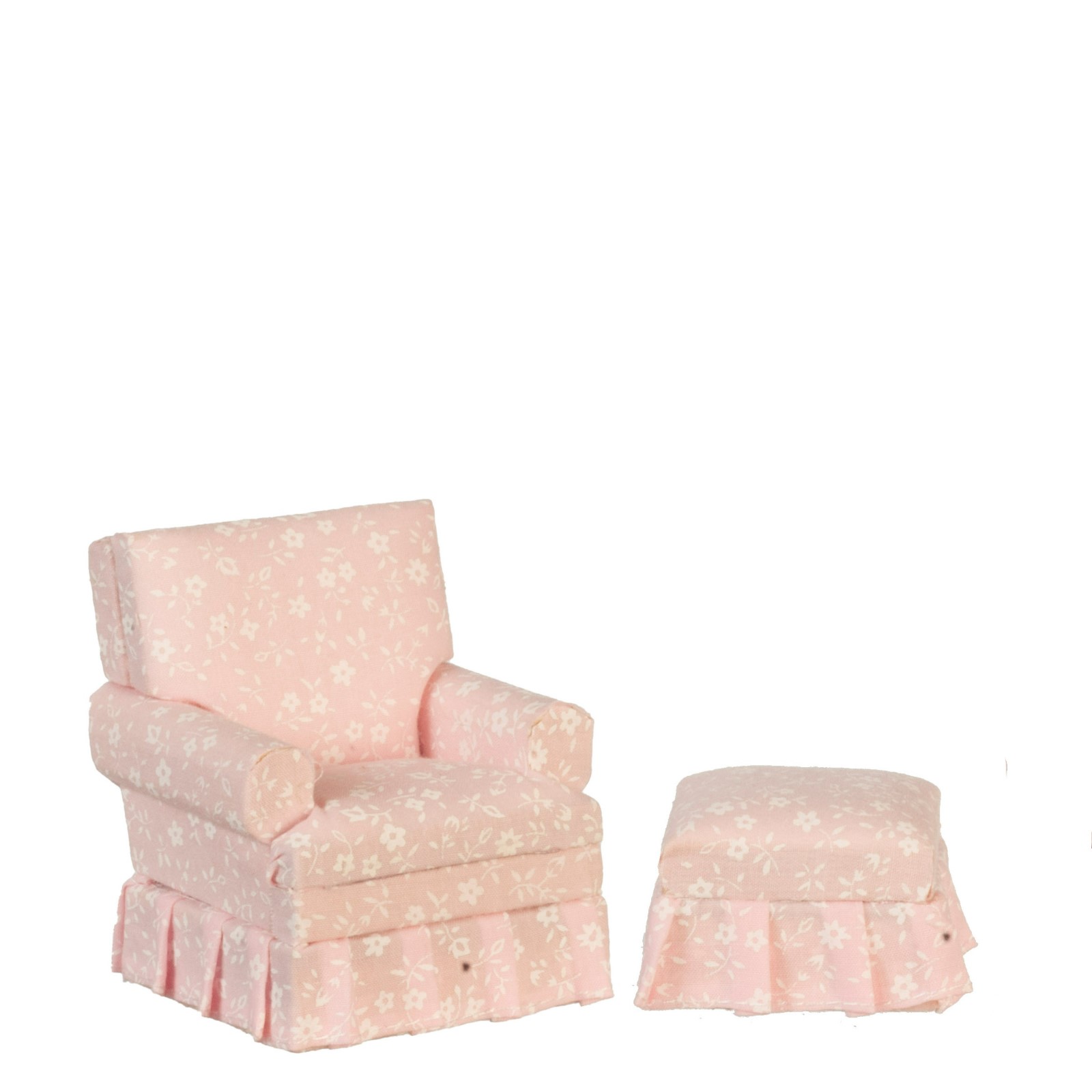 Dolls House Chair and Ottoman Pink Floral Lounge Furniture Miniature 1:12th Scale