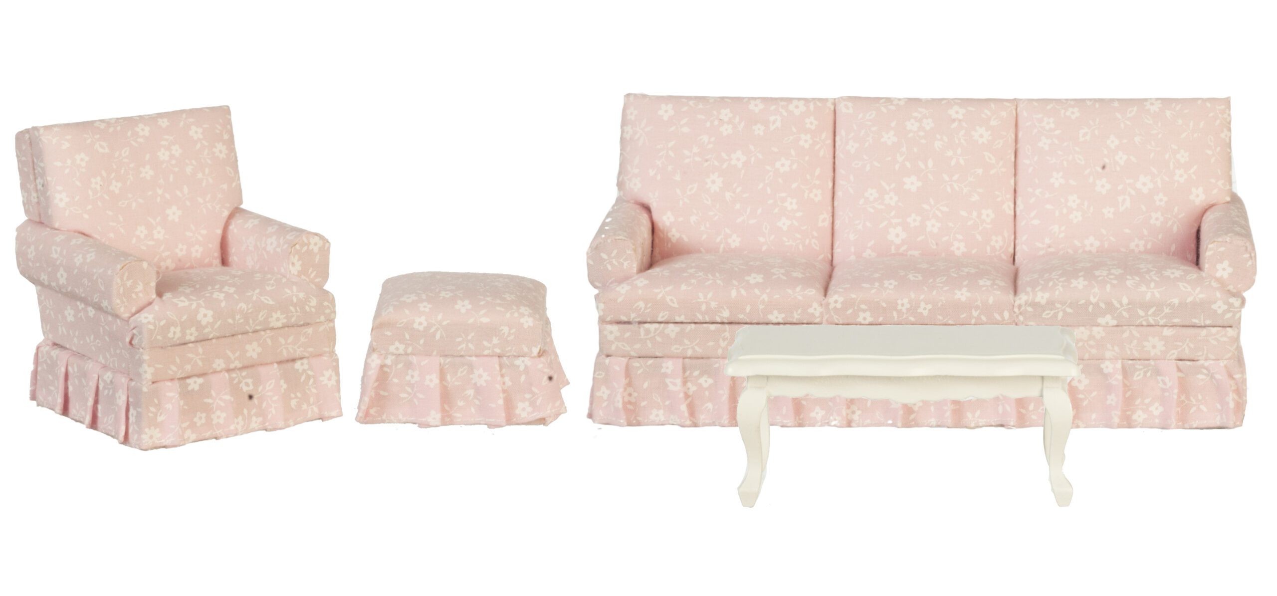 Dolls House Pink Floral Sofa, Chair, Ottoman and Table Set Miniature 1:12th Lounge Furniture