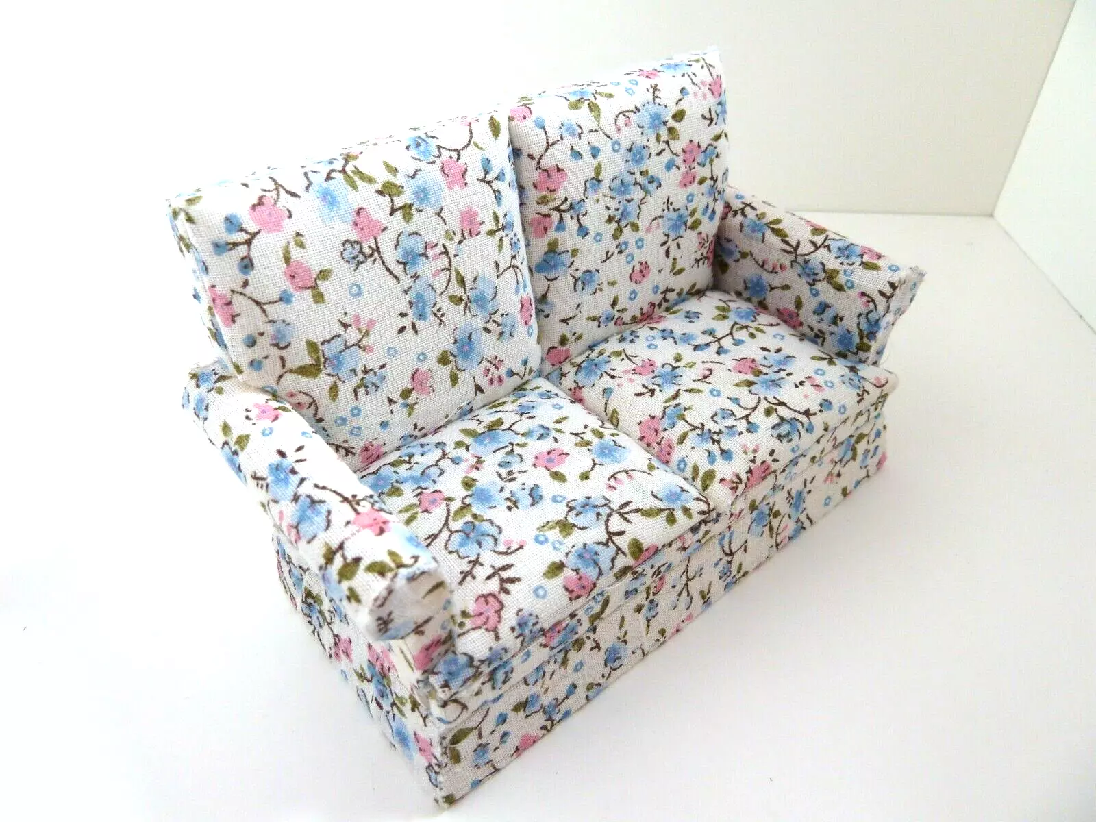 Dolls House Sofa Blue and Pink Floral Pattern Miniature 1:12th Scale Lounge Furniture